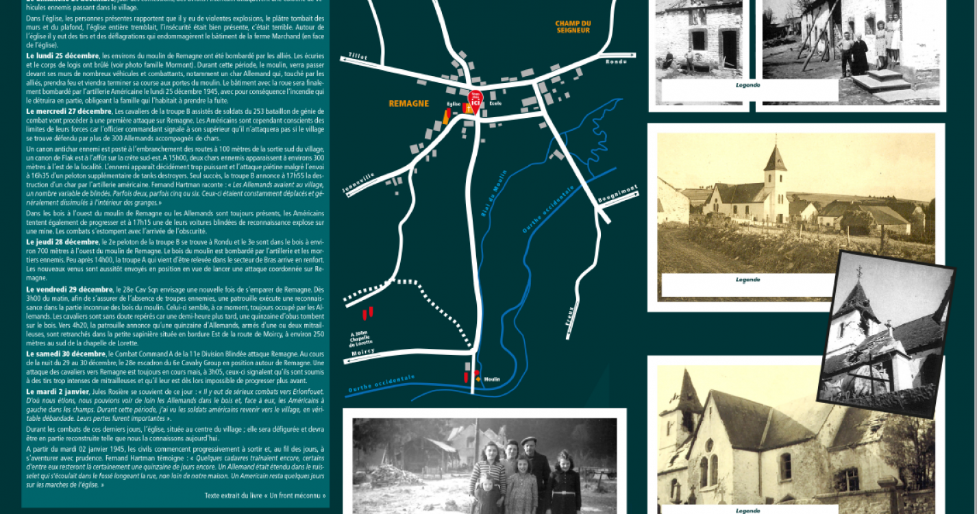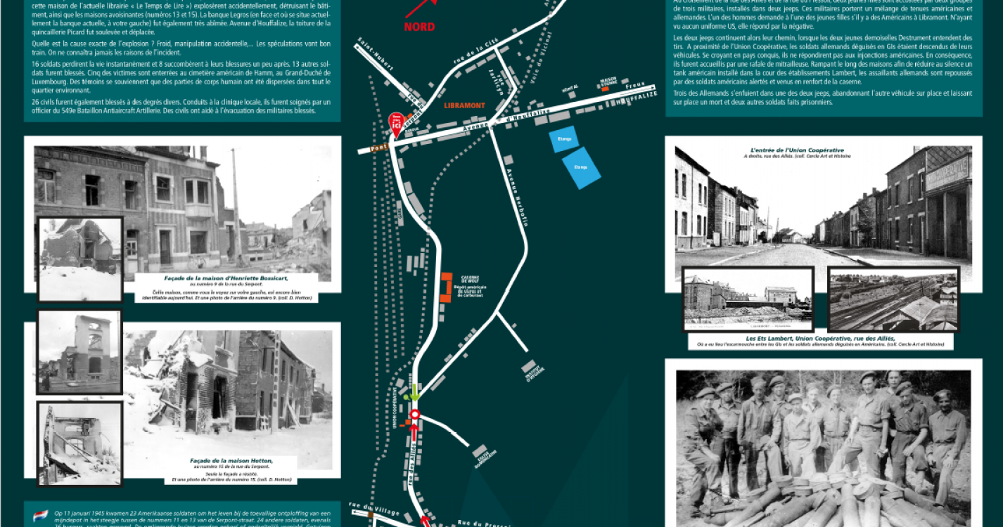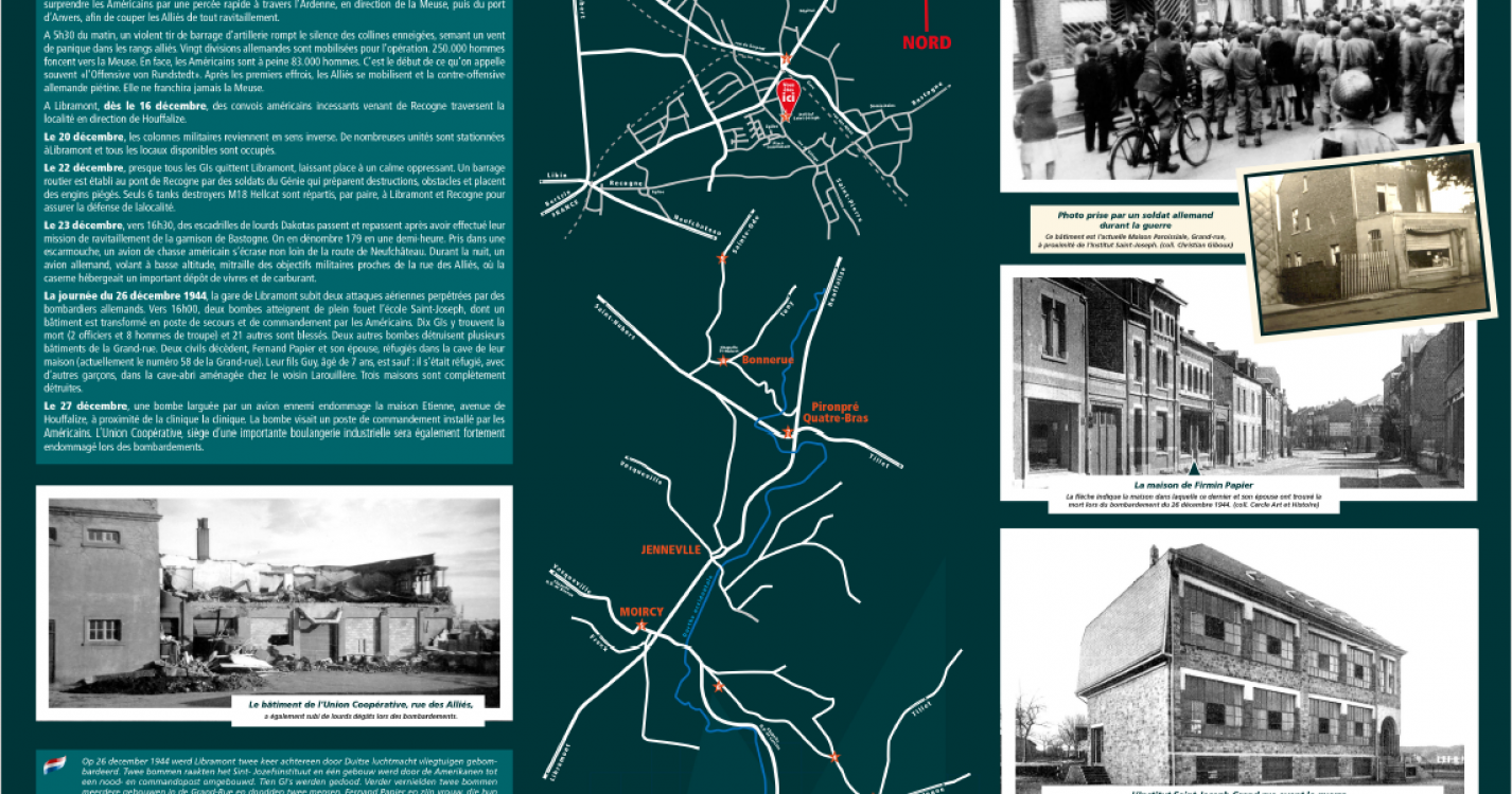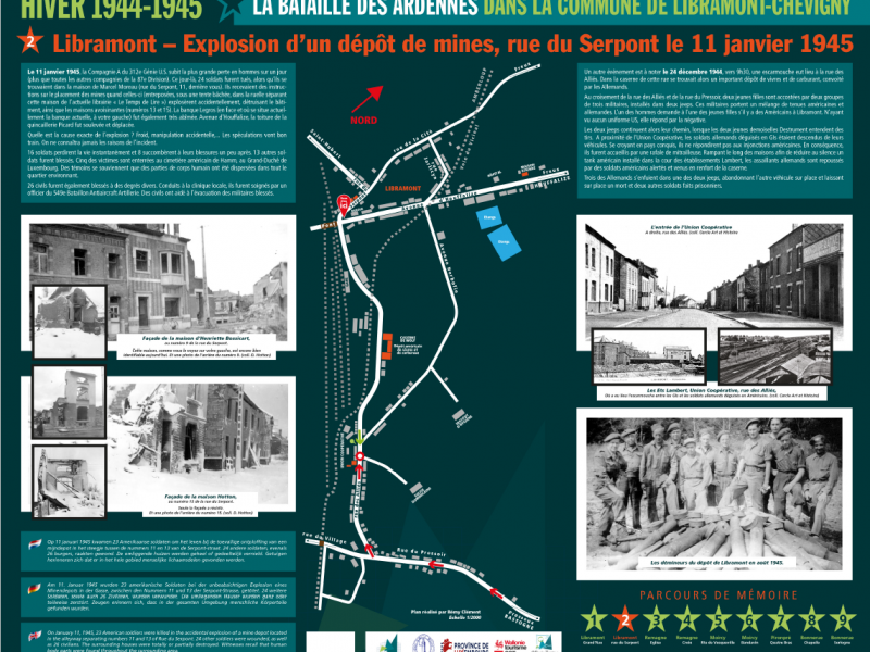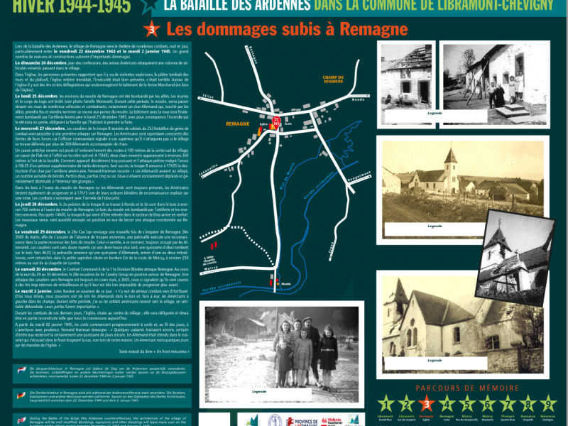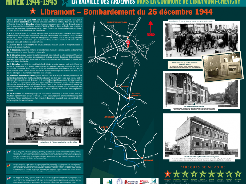 Le parcours est jalonné par 9 panneaux relatant la Bataille des Ardennes durant l'hiver 1944-1945 dans la commune de Libramont-Chevigny. Pour découvrir le dépliant complet: https://tourisme.libramontchevigny.be/mes-images/ok-depliant.pdf