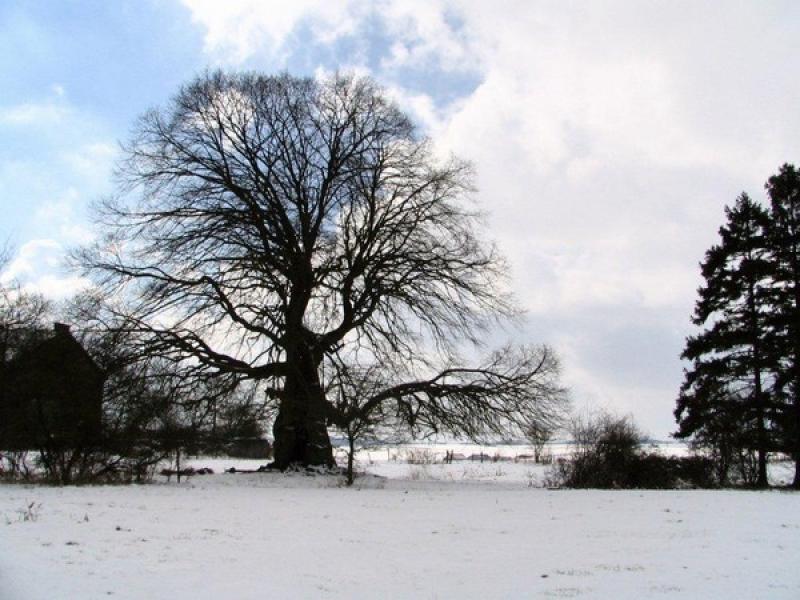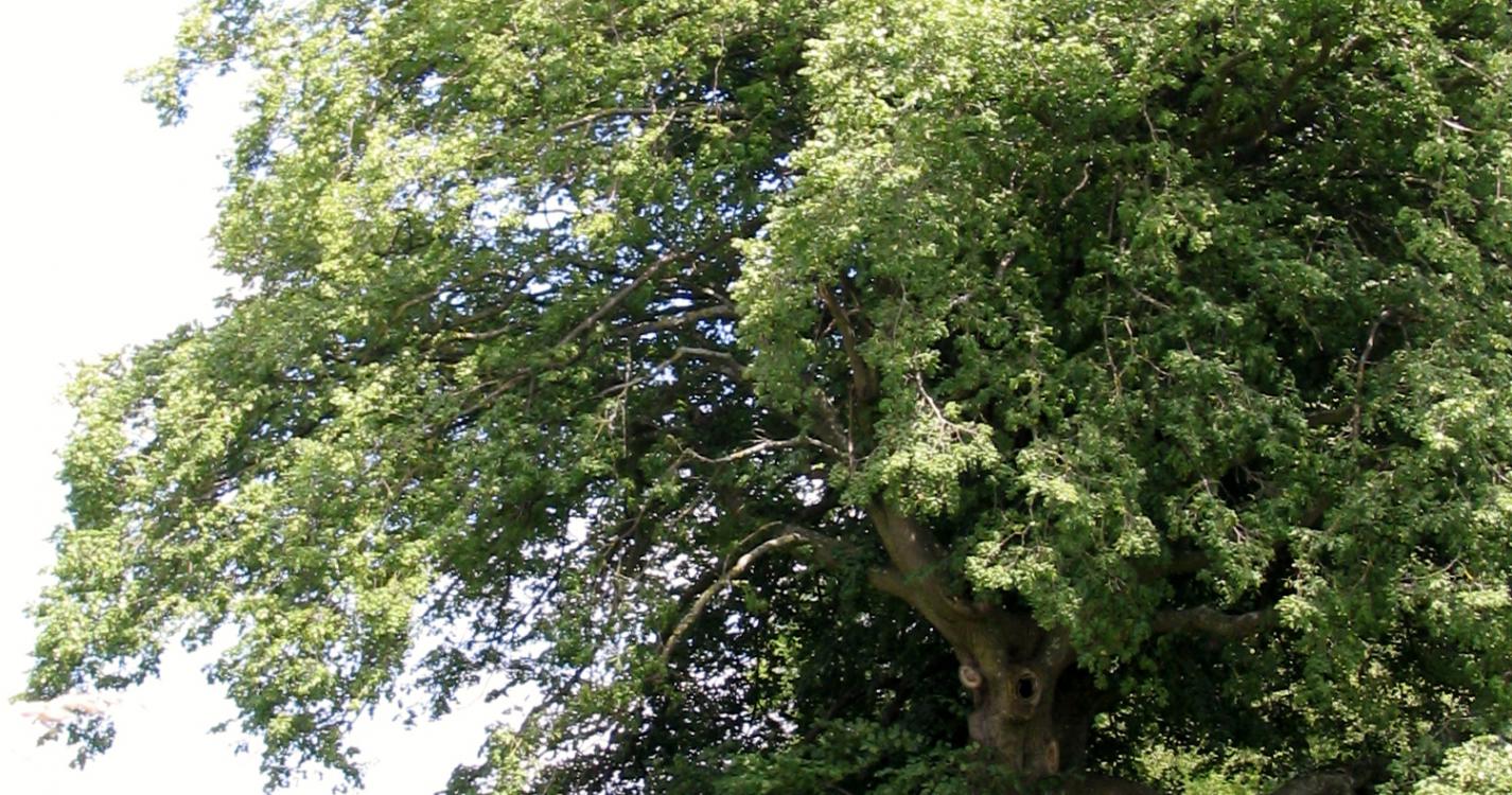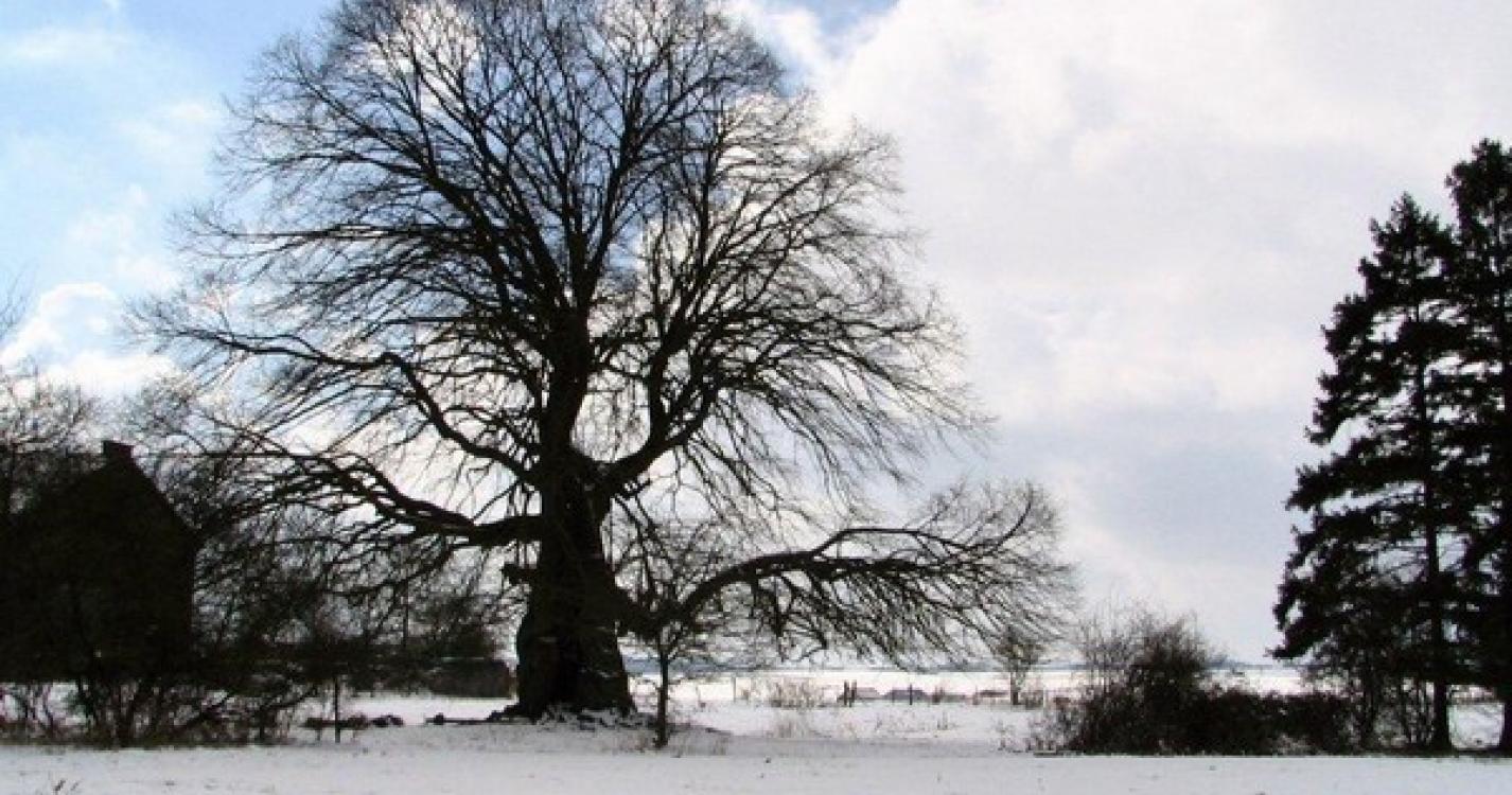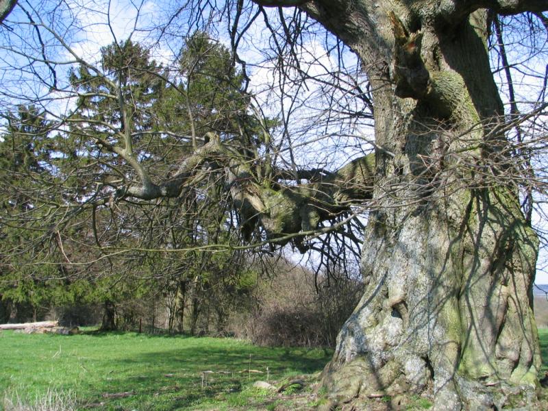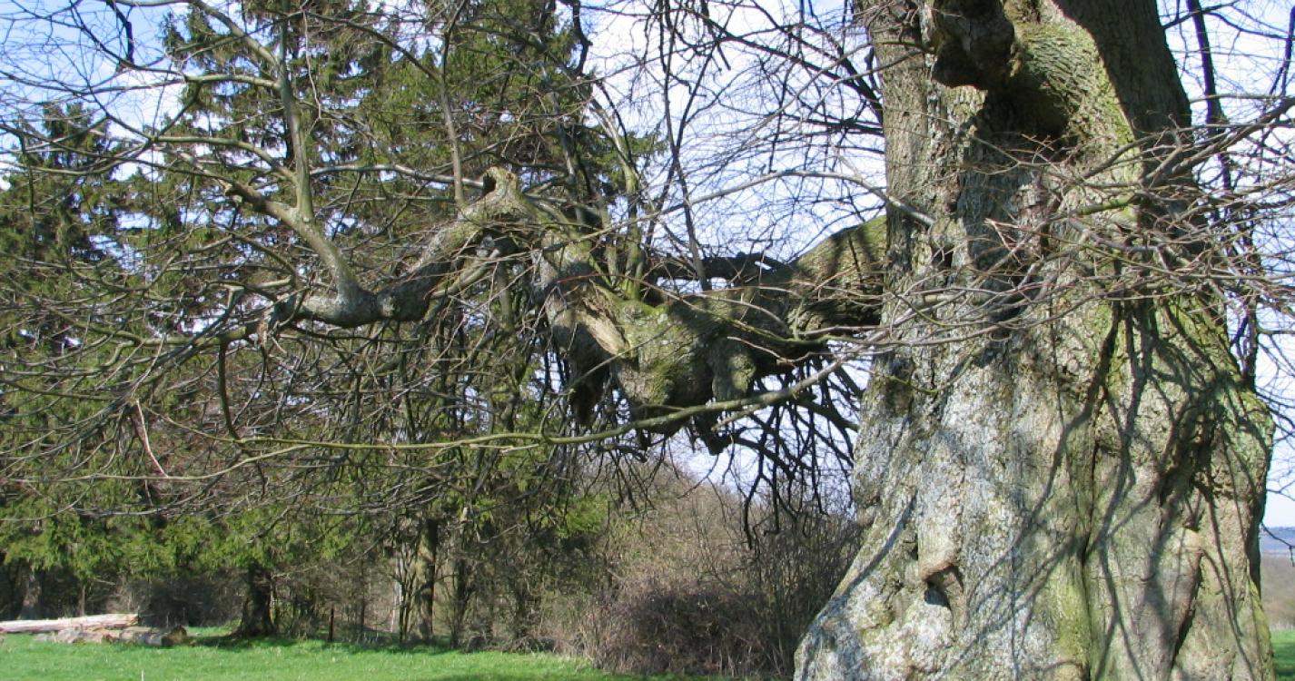 Tegenover de oude steengroevegebouwen staat een eeuwenoude lindeboom in een weiland. Volg deze weg en negeer het eerste pad rechts.