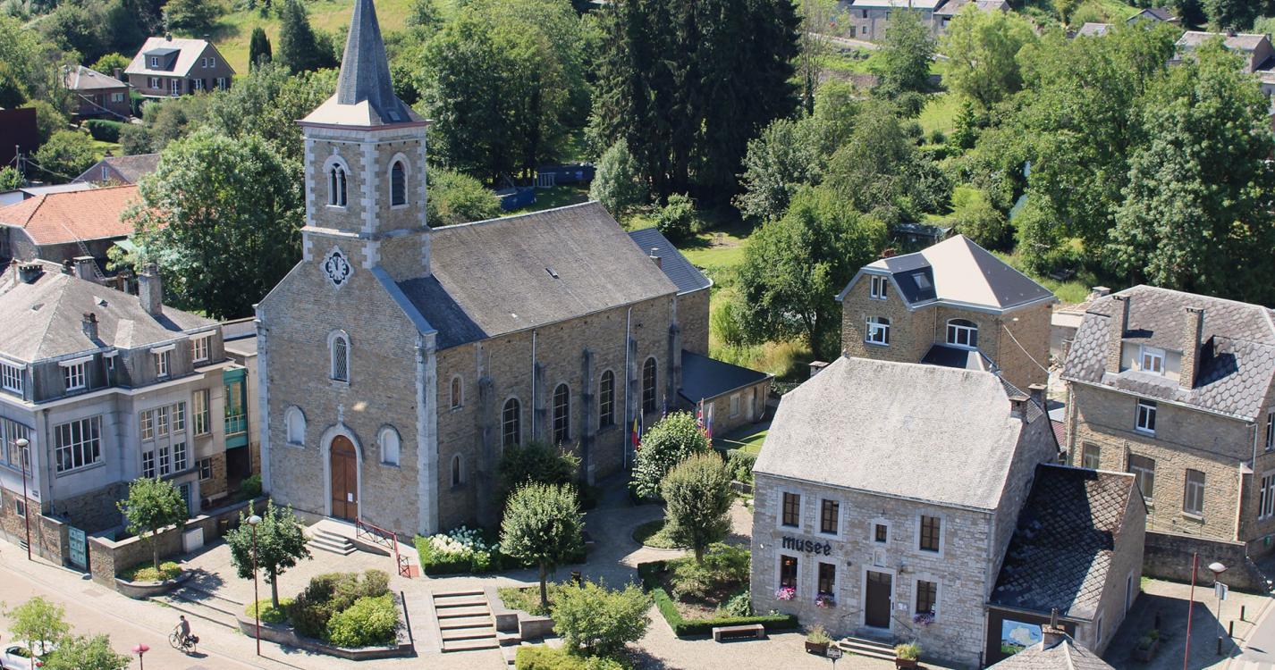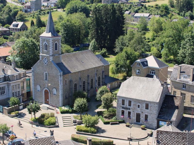 Begin net als MTB-route 3met de klim naar Thier Pierard en rijd door Oneux, in een rechte lijn, naar de begraafplaats. Ga door op het pad, dat verderop naar rechts draait en langzaam klimt, richting Chambralles. Voor het gehucht rechtsaf richting de kapel van Hoyemont. Neem vervolgens de weg naar rechts en ga rechtdoor op de rechte paden met uitzicht op het landschap (Grand Fawe). Bij Grand Fawe gaat u rechtdoor om af te dalen naar Comblain-la-Tour. Bij aankomst in het dorp steekt u de brug over en gaat u aan de linkerkant verder op de hoofdweg naar het voetbalveld. Neem in de bocht het pad naar rechts dat omhoog gaat naar de boerderij "Au-delà-des-Monts". Ga dan langs de zandafgraving van Larbois en sla dan linksaf naar het pad dat omhoog gaat naar de rand van het "Bois de Comblain" tot aan de Laan (la Drève). Ga daarna naar rechts en dan naar links in de richting van het pad dat zigzag afdaalt naar de boerderij van Raideux. Ga in een rechte lijn door het dorp Mont, boven over de Zwarte Rotsen en Chession. Ten slotte, tijdens de afdaling, slaat u rechtsaf richting het Sint Maartenspark en gaat u verder richting het centrum van Comblain-au-Pont.