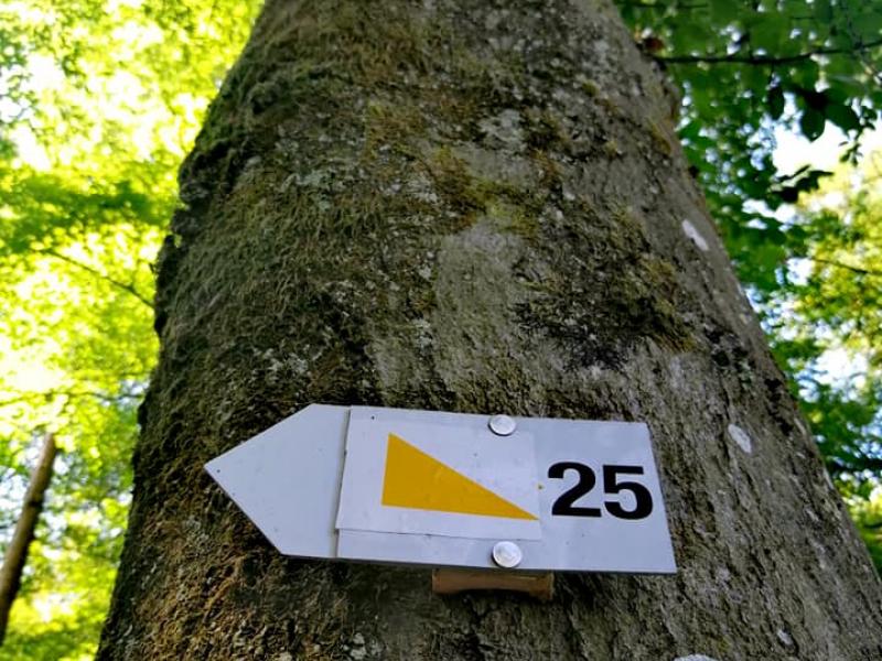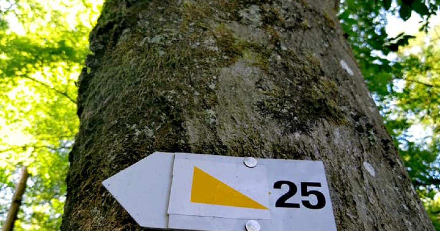 Suivre la balise « triangle jaune qui peut parfois devenir un losange jaune » numéro 25.