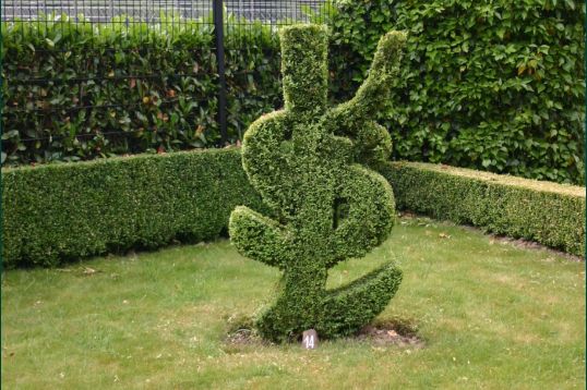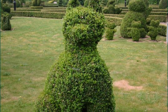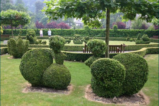 Deze figuren zijn het werk van Albert Navez en bestaan voor 95% uit struikgewas. De oudste struik heeft al maar liefst 120 lentes doorstaan maar is nog steeds weelderig. Het in vorm snoeien is een ware kunst waarvoor je veel geduld aan de dag moet leggen. Wat een vreugde als de artiest na het lange wachten zijn struik kan snoeien in de vorm van een grote, mooie figuur. De imposante olifant van 4 meter hoog, is gesneden uit een boom die maar liefst 80 jaar oud is. Ook Yves Saint Laurent heeft een speciale bestelling geplaatst. Je zult de buxus met zijn beroemde initialen in het park terugvinden.