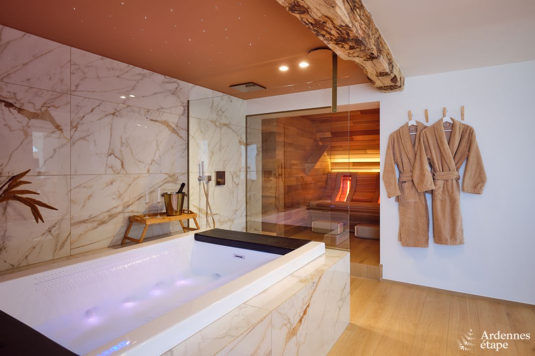Welkom in dit unieke vakantiehuis voor 2 personen in Aubel . Dit is geen gewoon vakantiehuis, het is een ervaring op zich. Met een infraroodcabine , jacuzzi en een romantische sfeer, is dit de perfecte plek voor een ontspannen vakantie. De woning is modern en comfortabel ingericht. De woonkamer is uitgerust met een cassettehaard , perfect voor gezellige avonden bij het vuur. De...