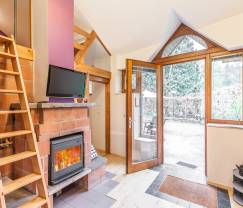 Bij aankomst in het vakantiehuis betreed je eerst de woonruimte met zithoek, eetruimte, en, direct achter de hoek, de keuken. De houtkachel in de zithoek zal tijdens de koude dagen je beste vriend zijn. Boven de woonruimte bevindt zich op de mezzanine een open slaapkamer die bereikbaar is via een ladder, alsof je naar een heuse boomhut klimt! De tweede slaapkamer bevindt zich op de begane grond op de gelijkvloerse verdieping.