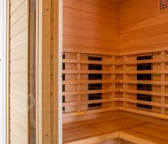 Dit vakantiehuisje werd in één ruimte ingericht waar de slaapkamer met de dubbele douche, de infraroodcabine, het salon en een beetje afgezonderd de keuken en eetkamer met elkaar grenzen. Last but not least: het bubbelbad met zicht op de omringende natuur.