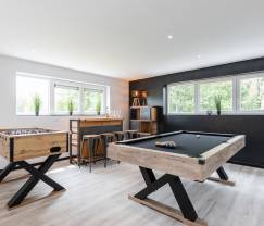 In dit vakantiehuis werd werkelijk aan alles gedacht om je verblijf zo aangenaam mogelijk te maken. Zodra je hier binnenkomt, valt de zeer verfijnde inrichting met kwaliteitsmeubels en vele leuke details op. De 2 slaapkamers en 2 badkamers zijn uiterst stijlvol en comfortabel. Ze zijn trouwens verdeeld over de begane grond (waar je ook beschikt over een bubbelbad en een infraroodcabine) en de eerste verdieping. Altijd handig voor personen met beperkte mobiliteit. Alle ruimtes zijn met evenveel smaak ingericht in een combinatie van hout en steen en genieten een rijke lichtinval. Beneden lopen de volledig uitgeruste keuken en de gezellige eet- en zitkamer in elkaar over, wat een zeer ruimtelijk gevoel schept. In de speelkamer kan je zowel kickeren, tafeltennissen en biljarten. De supporters kunnen intussen toekijken aan de leuke biertoog. Ook buiten nodigt alles uit tot lekker ontspannen. Of het nu barbecueën op je enorme, deels overdekte terras is of genieten van je grote tuin. Op die laatste zullen ook je viervoeters dol zijn. Hebben we al gezegd dat je hier 4 honden mag meebrengen? Tot besluit moeten we het nog even over de wellnessfaciliteiten hebben. Daar wacht je de moeilijke keuze tussen de jacuzzi, de zwemspa of de buitensauna. Wat probeer jij eerst uit?