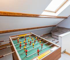 De indeling van de woning is perfect voor gezinnen. Op de begane grond vind je een dubbele slaapkamer met een badkamer met douche vlakbij, wat ideaal is voor ouders of grootouders. Op de bovenverdieping zijn er 2 slaapkamers, waarvan een met 4 bedden. De kinderen zullen dol zijn op de speciale speelruimte, uitgerust met boekengezelschapsspellen en een tafelvoetbalspel. Dit maakt het een perfecte plek voor de kleintjes om zich te vermaken. Voor de kleintjes is er een babybedje en een kinderstoel beschikbaar.