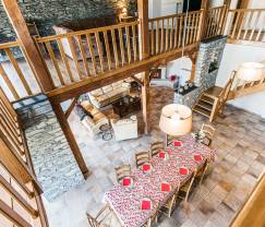Dit grote, stenen huis maakt al meteen indruk met zijn hoge gevel en prachtige, houten balken. Hout en steen geven dit vakantiehuis een rustieke uitstraling, en ook de inrichting versterkt die authentieke sfeer. In de open leefruimte kan iedereen verzamelen rond de haard. Ook heel leuk: de keuken geeft uit op het terras en de tuin, wat het buitenleven nog een tikkeltje aangenamer maakt.