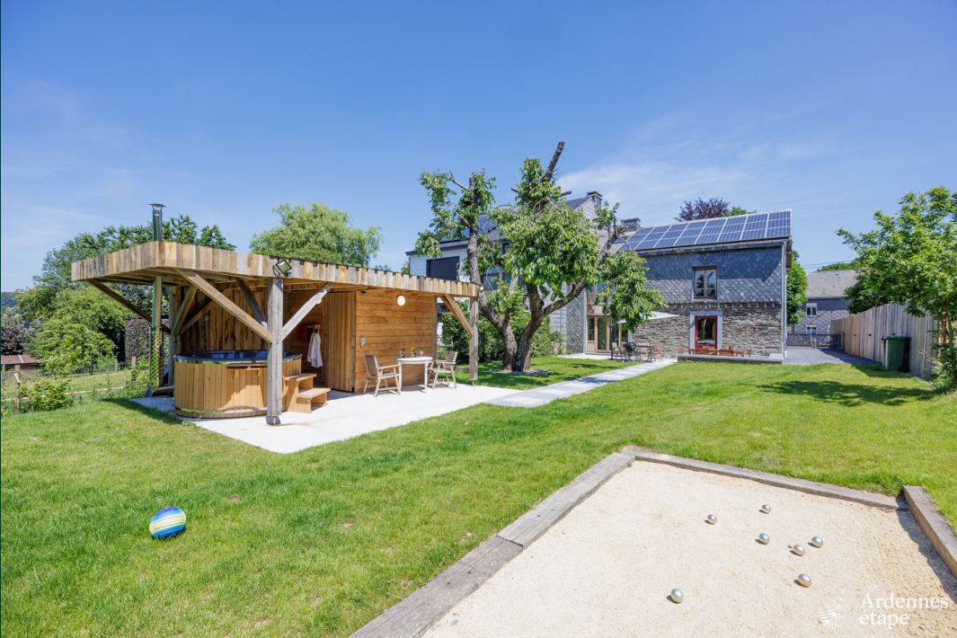 Ardense steen, authentieke balken & een knus interieur zorgen voor een gezellige vibe. Begin je ’s ochtends meestal gehaast aan je dag? Hier niet! Dans in de keuken en geniet met volle teugen van je ontbijt, wandel naar het bos vlak bij het huis om wat extra vitamine D op te doen of ontspan in het houtgestookt warmwaterbad achteraan de tuin. Wat je verder zeker nog moet doen? Biljarten in de mooie speelzolder, je in de knusse zetel nestelen met een goed boek of petanquen in de tuin!