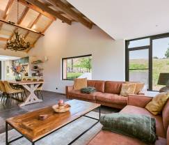 De woonkamer is licht en warm ingericht, met grote ramen die een adembenemend uitzicht bieden op de vallei. Dit uitzicht is niet alleen vanuit de woonkamer te bewonderen, maar ook vanuit de verschillende buitenruimtes rondom jullie vakantiehuis. Er zijn meerdere gezellige hoekjes waar je kan ontspannen, afhankelijk van je stemming en het moment van de dag. Het overdekte terras nodigt uit tot lange avonden, terwijl het skyterras met tuinmeubelen en parasol perfect zijn om overdag te genieten van de zon en de rust.