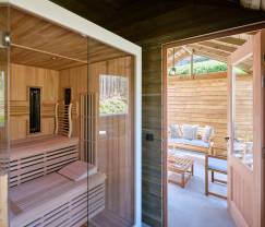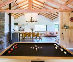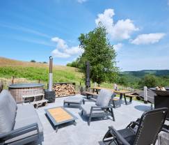Voor ontspanning hoef je de vakantiewoning niet te verlaten. Er is een houtpelletkachel die voor een gezellige sfeer zorgt, een houtgestookte hottub waar je heerlijk in kunt ontspannen, en zelfs een buitensauna voor een weldadige wellnesservaring. Binnen vind je ook een bar en een ontspanningsruimte met biljart en darts, ideaal om samen plezier te maken. Voor de sportievelingen is er een overdekte fietsenstalling voorzien. Buiten vinden jullie ook een petanqueveld met terras dat uitkijkt op de vallei.