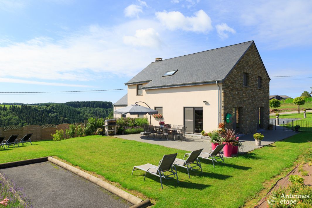 Ideaal voor 10 personen, biedt dit 3.5-sterren vakantiehuis in de provincie Luxemburg 5 ruime en mooi ingerichte slaapkamers. Vier slaapkamers zijn gelegen op de bovenverdieping, evenals 2 zeer moderne badkamers. De 5e slaapkamer bevindt zich op de begane grond en is voorzien van een eigen badkamer. Je profiteert ook van een mooie keuken met moderne apparatuur van hoogwaardige kwaliteit. Het hart van het huis, de woonruimte, zal je betoveren met de heerlijke sfeer die er heerst. De decoratie geeft het geheel een onweerstaanbaar karakter en de grote ramen verlichten de ruimte. In de kelder verwelkomt de speelkamer met biljart, tafelvoetbalspel en darts jou voor momenten van ontspanning in een gezellige sfeer. Ten slotte is de buitenkant van de vakantiewoning een waar genot. Vanuit de tuin, met petanqueterrein en gezellig terras met barbecue, kun je genieten van een prachtig uitzicht over de omgeving.