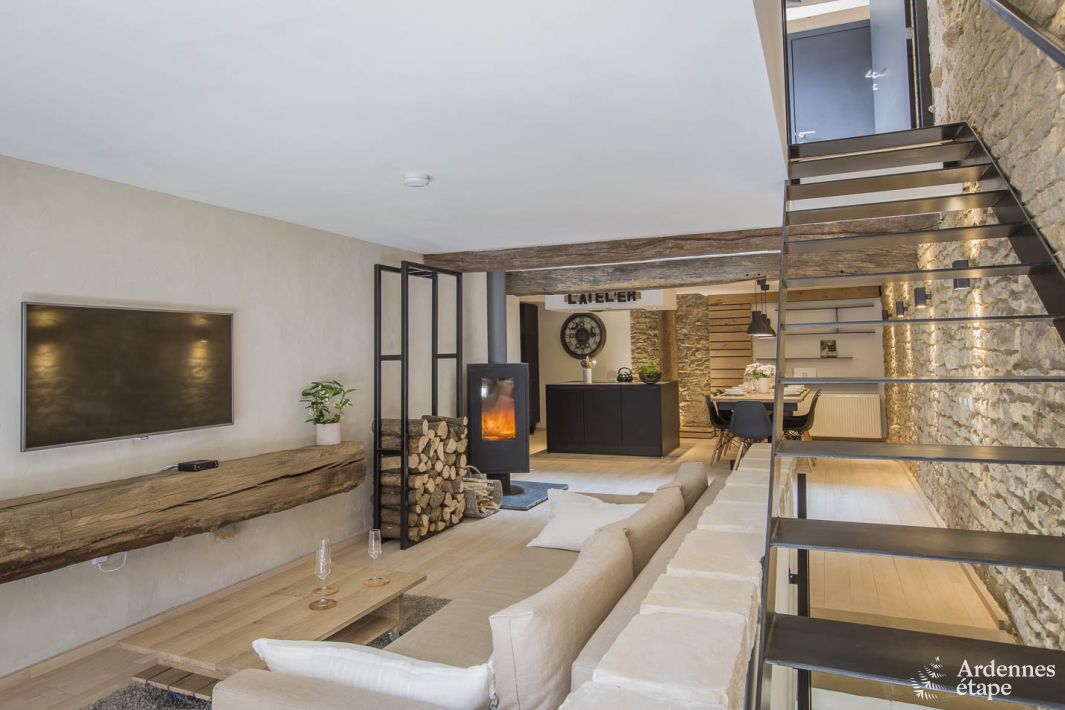 Zodra je de gite betreedt, bewonder je de schoonheid van de plaats. De eigenaren hebben twee jaar hard gewerkt voor dit perfecte resultaat. Ze combineerden lokale stenen, beukenparket, metaal en kalk om het typische karakter van de schuren te behouden. Het mengsel van deze materialen zorgt voor een harmonieuze en warme sfeer.