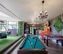Groepen zullen dit huis waarderen, waar ze samen kunnen komen en tegelijkertijd kunnen genieten van de bijgebouwen om zich af te zonderen. Verschillende kleine kamers (met internet), eetkamer, speelkamer met biljart, tafelvoetbal, airhockey en talrijke spelconsoles voor jong en oud: een echt pretpark!