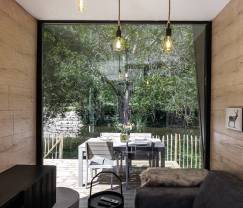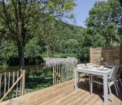 Klein maar fijn. Ongelooflijk fijn zelfs! Want ondanks de kleine afmetingen geniet je in de leefruimtes van dit tiny vakantiehuisje toch van airco, een volwaardige keuken met alles erop en eraan, een knusse zitruimte met tv en een enorm raam dat rechtstreeks uitkijkt op de rivier die op 10 meter van je ligt. Je hebt ook een complete badkamer met douche, wastafel en wc. Overnachten doe je op de bovenverdieping in 2 mezzaninekamers. Deze hebben op het eerste zicht een laag plafond, maar daar wen je onmiddellijk aan. De ene heeft een dubbel bed, de andere 2 eenpersoonsbedden. Ideaal voor een gezin, dus! Buiten heb je een tuintje en een houten terras waar je kan eten en barbecueën. Goed om te weten: ook je hond is hier welkom!