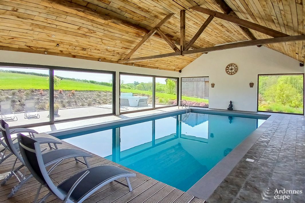 Een vakantiehuis waar comfort centraal staat met 3 slaapkamers en privébadkamers, een speelruimte ... Op het terrein midden in de prachtige natuur is een binnenzwembad te vinden. En in de zomer staat er zelfs een jacuzzi voor je klaar!