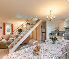Deze vakantiewoning bestaat eigenlijk uit twee woningen, die met elkaar verbonden zijn via de eetkamer. Je beschikt hier over 6 slaapkamers en 4 badkamers, ideaal voor grote groepen of meerdere gezinnen. Voor de jongste gasten zijn er 2 babybedjes en 2 kinderstoelen beschikbaar, evenals een aankleedkussen.