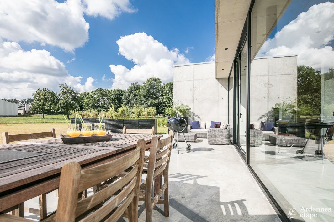 Dit hedendaags vakantiehuis in de Ardennen bevindt zich in het Land van Herve, in de provincie Luik (België), meer bepaald in de gemeente Voeren. Deze streek in de Ardennen beschikt over prachtige valleien, waar het aangenaam wandelen is langs het platteland en dorpjes, zoals Dalhem. De dichtstbijzijnde winkelstad is Visé, waar je tal van gastronomische specialiteiten en een RAVel-wandelpad kan ontdekken.