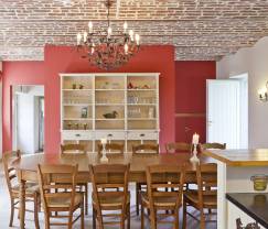 De prachtig gedecoreerde leefruimtes lijken stuk voor stuk zo uit een woonmagazine te komen. De stijlvolle woonkamer met comfortabele banken, sfeervolle open haard en subtiel gekleurde kleedjes, kussens en gordijnen, is een heerlijke ruimte om in te verblijven. Aan de lange houten eettafel kun je met gemak 12 personen kwijt. Ook deze ruimte werd met zorg aangekleed en leent zich prima voor fijne conversaties, het nuttigen van een lekkere maaltijd en urenlang natafelen. De landelijke, volledig ingerichte keuken vormt een van de eye-catchers van het huis. Met een 4-pits elektrische kookplaat, oven, magnetron, diepvries, koelkast en afwasmachine beschik je over alle apparatuur om een uitgebreide maaltijd te bereiden. Ook basisapparatuur zoals koffiezetapparaat, waterkoker, soepmixer en vruchtenpers is aanwezig.