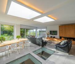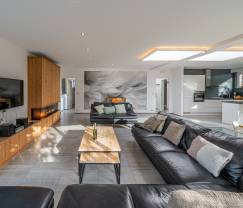 Vanuit de leefkamer zie je de tuin en heb je een panormaisch zicht op de omgeving. De glazen vloer kan voor vermakelijke situaties zorgen: hij laat toe om de kroost in de gaten te houden terwijl die zich aan het uitleven is in het verwarmde binnenzwembad. Het zwembad dat op een verdieping lager ligt, zal trouwens iedereen van de groep bekoren. Je zult veel tijd doorbrengen in deze ontspanningsruimte die ook als saunaruimte is ingericht. Ontworpen en uitgerust voor 12 personen, is deze 4.5 sterren huurwoning uitermate geschikt voor families of groepen.
