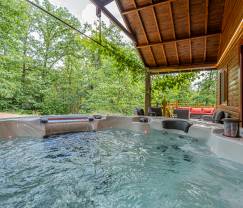 Cadre idyllique dans la nature! Terrasse entourée de bois et d'écureuils. Nous avons bien profité du jacuzzi, même s'il pleuvait, grâce à la terrasse couverte