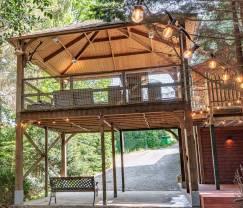 Het grote overdekte terras is bijzonder aangenaam: het geeft het gevoel alsof je in een boomhut zit, maar dan wel heel comfortabel. Je kunt er het hele jaar door van genieten, want het is verwarmd en verlicht. Een ervaring die je niet mag missen!