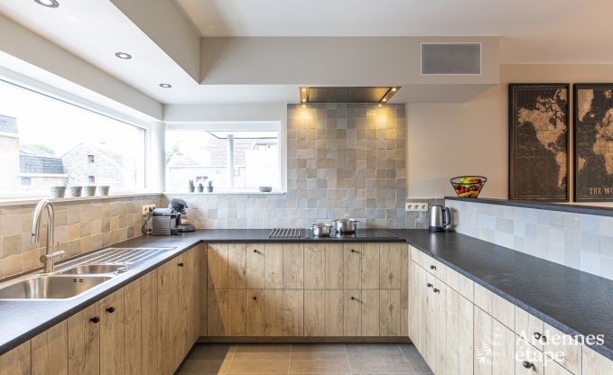 Dit vakantiehuis in Wéris met vier kamers, twee badkamers (waarvan één en suite) biedt veel ruimte, lichtinval én een grote tuin. Verken de Ardennen met het hele gezin.Door het gebruik van hout en zachte kleuren baadt dit huis in een gezellige sfeer. Ideaal voor knusse momenten met het hele gezin of met vrienden. De grote kamers bieden ruimte voor iedereen. Zo kun je in de open, lichte woonkamer allemaal samen gezelschapsspelletjes spelen. In de grote tuin zullen vooral je kinderen zich uitleven!Het dorpje Wéris aan de rand van de Fagne-Famenne (provincie Luxemburg) is een van de mooiste dorpjes van Wallonië. Je kunt er een wandeltocht met het hele gezin (van 2, 4 of 6 km) maken tussen de weiden, velden, boerderijen en stenen huisjes door. Ondertussen kom je de 'schatten' van het dorp tegen, zoals de beroemde megalieten. Het charmante Durbuy ligt op slechts een paar kilometer van je vakantiehuisje. Daar werd een pittige wandeling uitgestippeld, die je van de rustige oevers van de Ourthe naar het historische centrum leidt.Dit huisje ademt die typische Ardense sfeer, maar dan in een hedendaags jasje. Je zult er geen genoeg van krijgen!