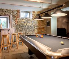 De grote eetkamer van dit vakantiehuis heeft een zeer grote lange tafel dat deel uitmaakt van de speelkamer, met bijbehorende grote zetel en biljarttafel. En zo een gezellige sfeer creëert in deze open ruimte. Een tweede speelkamer nodigt u uit voor ontspannende momenten rondom de haard en heeft bovendien tal van kinderspellen. Zin in partijtje darts of om tafelvoetbal te spelen? Of toch liever een film meepikken op de TV met DVD? Dit is allemaal mogelijk in deze gezellige ruimte met voldoende zetels voor heel de familie. Toch even iets opzoeken op het internet? Er is een draadloze internetaansluiting.