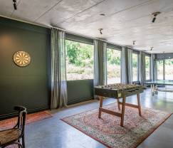 De woonkamer is ontworpen om een complete ervaring te bieden, met een speciale ruimte voor baby's en een fietsenruimte uitgerust met een reinigingsset voor liefhebbers van fietstochten. Vermaakliefhebbers komen ook aan hun trekken dankzij de speelkamer met een tafelvoetbal, een darts en een tafeltennistafel. Voor avonden bij het haardvuur creëren een houtkachel en een open haard een warme en gezellige sfeer, perfect om samen te komen na een dag vol avonturen.