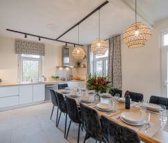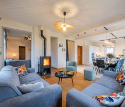 De gezellige woonkamer met houtkachel zorgt voor een knusse sfeer tijdens koelere avonden, zeker in de kerstperiode. De aanwezigheid van een bar binnen maakt het mogelijk om samen met familie of vrienden te genieten van een drankje in een ontspannen setting.