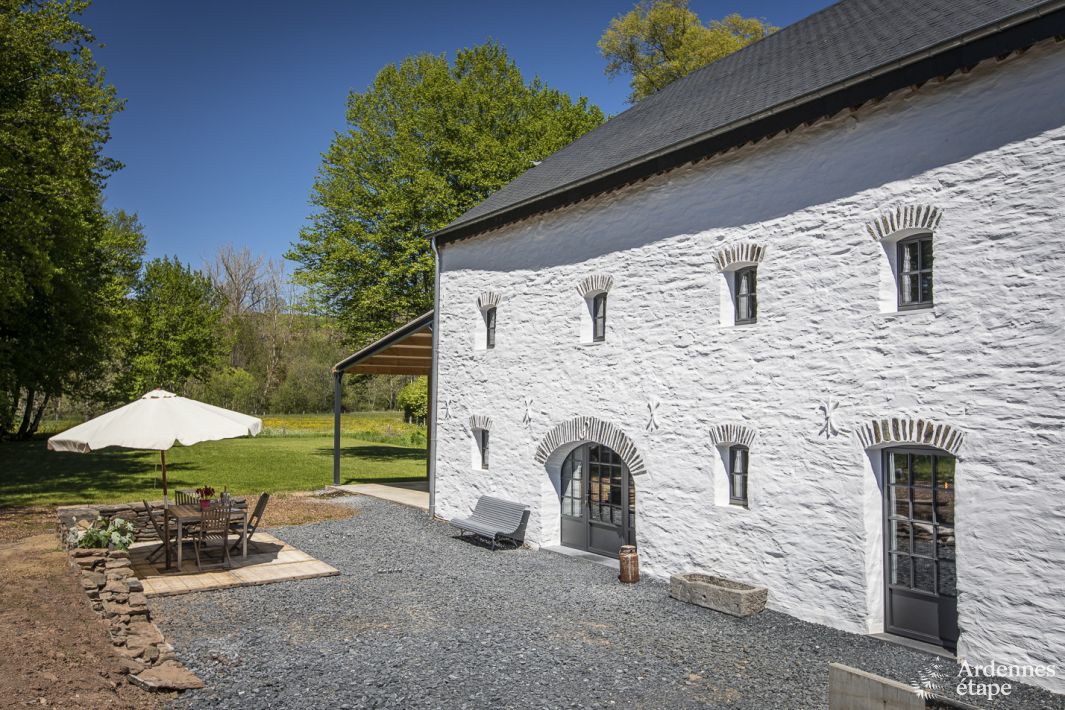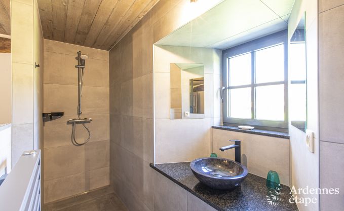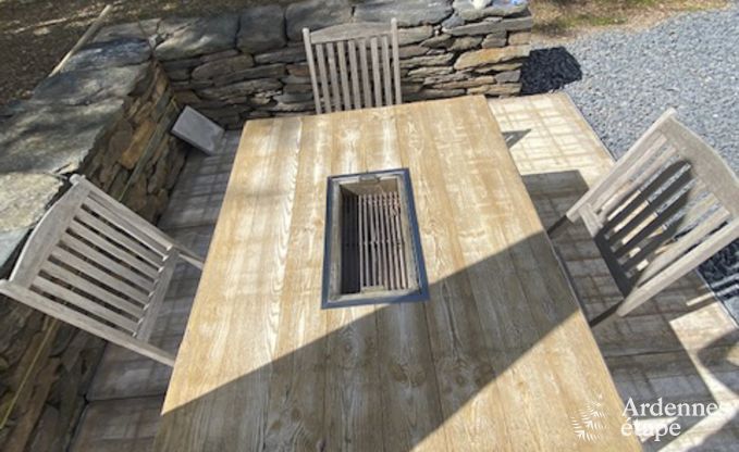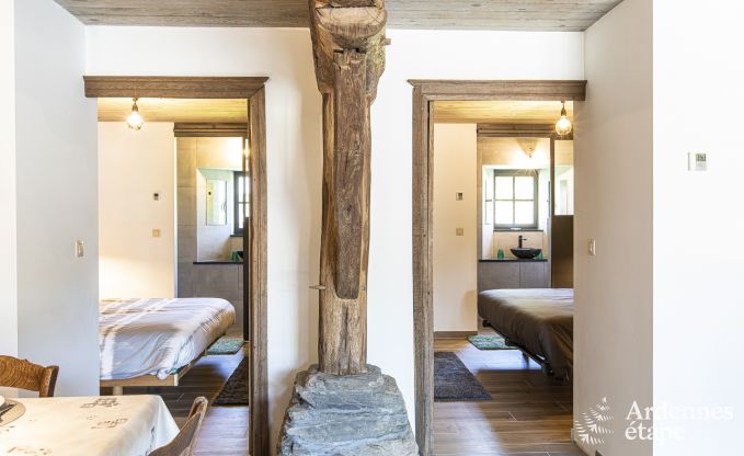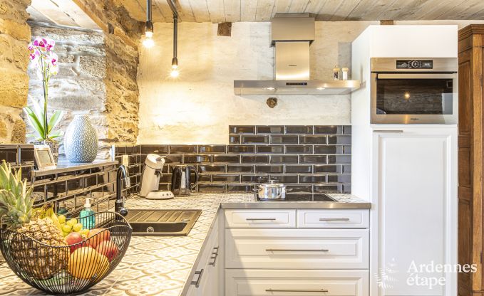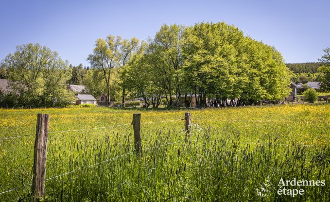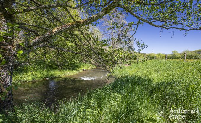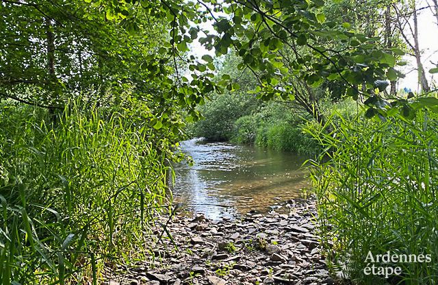 De inrichting van dit prachtige vakantiehuis voor 4 personen doet denken aan een leuke rommelmarkt. Door de vele antieke voorwerpen hangt er een originele en persoonlijke sfeer. Wedden dat je versteld zult staan van de timmermanswerkbank die tot tv-meubel werd omgetoverd, van de hoofduiteinden van de bedden, het oude houten spel? De zichtbare houten balken en de muren in Ardense steen geven het gebouw een warm en oud cachet. Dit 3,5-sterrenvakantiehuis telt 2 slaapkamers en 2 badkamers, en is binnen net zo comfortabel als buiten. Naast de enorme, volledig omheinde tuin van 2ha en het gezellige hoekje met vuurkorf in de schaduw van de bomen is er nog een beekje met een eigen oever van 250 meter dat onderaan de tuin stroomt. Ideaal voor verkoeling op zomerse dagen. Laat je betoveren door de idyllische sfeer, zowel in de zomer als in de winter.
