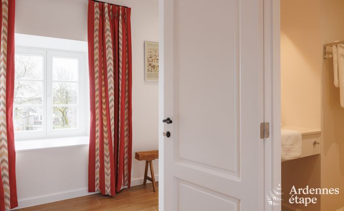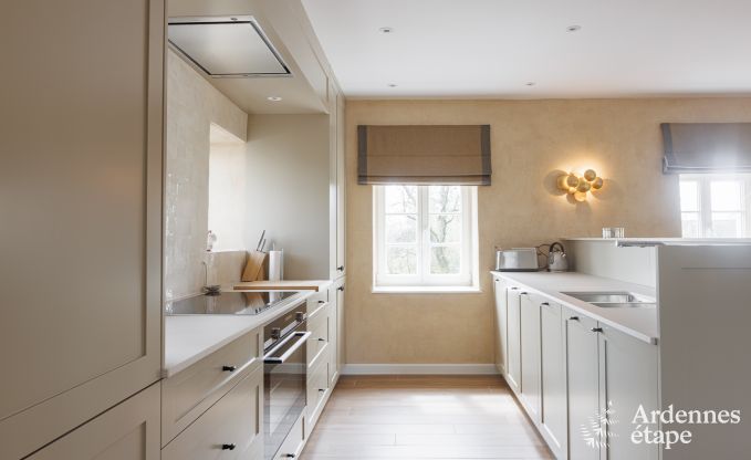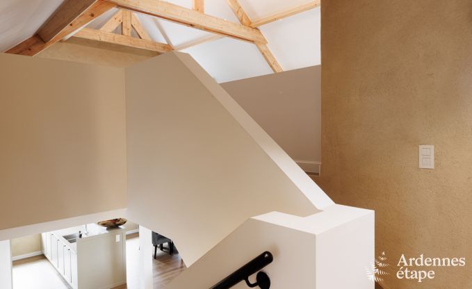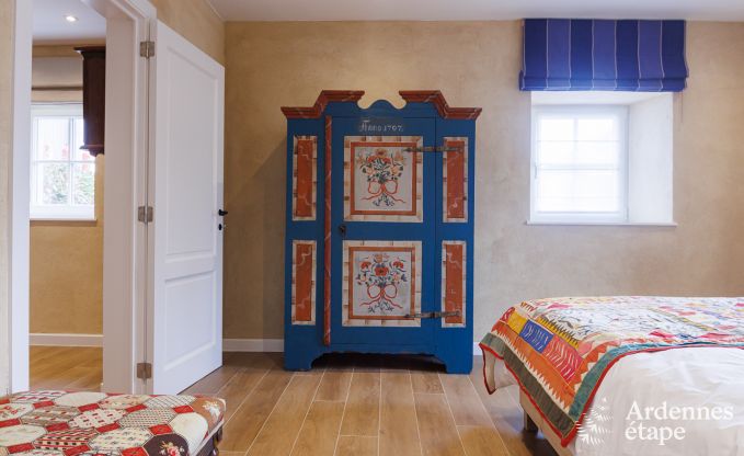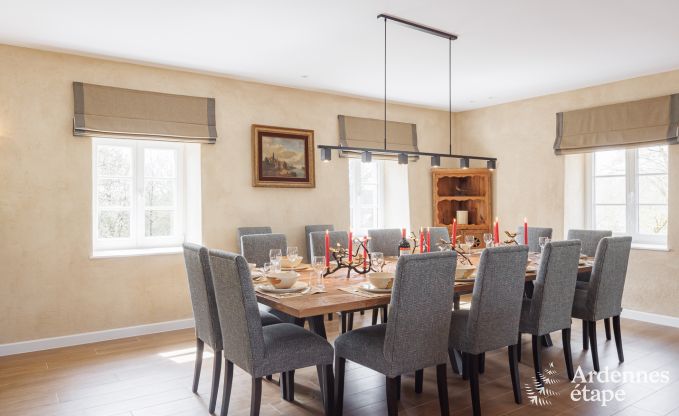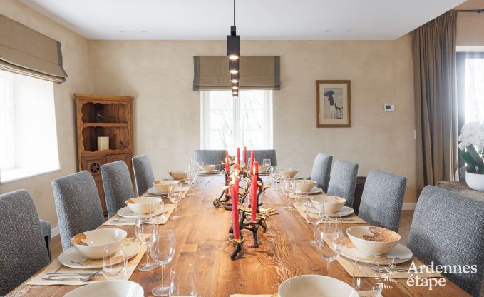 Je vakantiewoning verwelkomt je met een warm en ruim interieur met mooi gestucte muren en een mooie massief eiken parketvloer. De stijlvolle aankleding wisselt mooie nieuwe meubels af met enkele knappe oude meubels met patina. Het interieur leent extra karakter uit decoratieve attributen als een oud schoolbankje, een geborduurd wandkleed aan de muur, kleurrijke, geborduurde bedspreien uit India, een oude Chinese kledingkast... Elk van de 5 slaapkamers heeft zijn eigen slaapkamer dus iedereen geniet maximale privacy. De meeste slaapkamers bevinden zich trouwens op de gelijkvloerse verdieping, altijd handig voor personen met een beperkte mobiliteit! In de zitkamer beleef je in de knusse zetels gezellige avonden aan het knetterende vuur in de cassetehaard. Tenzij je TV wil kijken in de uitnodigende mezzanine, natuurlijk. De perfect uitgeruste keuken nodigt uit tot het bereiden van heerlijke maaltijden, die dubbel en dik zullen smaken aan de ruime tafel in de eetkamer. Je zal zeker ook eens willen barbecueën op het terras dat boven de enorme tuin uittorent, waar je kinderen kunnen ravotten op een schommel en een glijbaan. En waar je hond met 3500 m² alle plaats heeft om zich de tong uit de bek te rennen. Iets grotere kinderen zullen zich dan weer uitleven in de speelkamer met de gezelschapsspelletjes of aan de voetbaltafel. Buiten kan je elkaar zelfs uitdagen voor een partijtje pingpong. Op je privéparking is plaats voor 5 auto's.