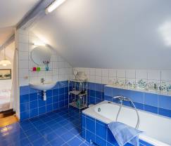 De zeer mooie slaapkamer (met een bed en een slaapbank) en de ruime badkamer vind je op de eerste verdieping.