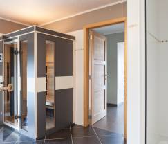 Via een trap kom je in de gezellige woonkamer, waar je mooie momenten door zult brengen met vrienden of familie. De kamer geeft ook direct toegang tot het houten terras met uitzicht op de tuin. De speelkamer en de wellnessruimte bevinden zich ook op de eerste verdieping.