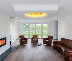 Ernaast ligt een heldere en comfortabele designzithoek waar je onvergetelijke avonden aan het haardvuur zult doorbrengen.