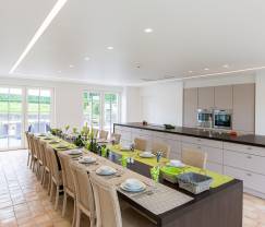 De zeer goed uitgeruste keuken geeft uit op de eetkamer. Dit wekt een aangenaam ruimtegevoel op en draagt bij tot de gezelligheid in het huis.