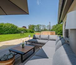 Buiten wacht een verhoogd privéterras omringd door weelderige vegetatie die zorgt voor rust en privacy. Hier kan je genieten van comfortabel tuinmeubilair, een houtgestookte hottub om te ontspannen en een petanqueveld voor gezellige wedstrijden met vrienden of familie.