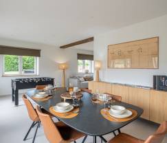 Het vakantiehuis beschikt over 3 slaapkamers, elk met een eigen badkamer en toilet, zodat je volop privacy hebt. Het voelt hier echt aan als een verblijf in een hotel: de bedden zijn opgemaakt, handdoeken liggen klaar en er zijn zelfs toiletartikelen zoals zeep en shampoo voorzien. Voor fietsers en motards is er een beveiligde fietsenstalling en een fietsverblijf met reinigingskit. Ook aan de allerkleinsten is gedacht: verschillende babybenodigdheden zijn aanwezig. Voor de spelletjesliefhebbers is er een tafelvoetbalspel en een mooie collectie gezelschapsspellen.