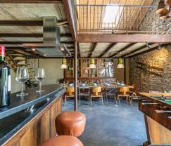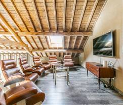 Met een voetbaltafel, een jukebox, een bar en een tv-hoek met oude bioscoopstoelen op de mezzanine lijkt de woonkamer eerder een grote speelzaal. En dat alles wordt gecombineerd met een handige en comfortabele indeling.