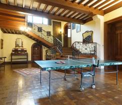 Eenmaal boven bevindt je je in het hoofdvertrek dat meteen ook de grootste leefruimte van deze kasteelwoning is. Het bestaat uit een eetruimte, een zitruimte met televisie, een speelhoek voor de kinderen en een tafeltennistafel. In hetzelfde vertrek leidt een imposante trap, die zo uit een Disneyfilm zou kunnen komen, naar de eerste verdieping. Maar laat ons eerst ons bezoek aan de voornaamste verdieping afronden.
