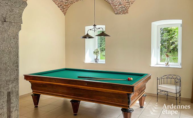 Deze riante vakantiewoning voor 21 personen in Hannut, provincie Luik, is uniek gelegen midden in een park en werd ingericht in de bijgebouwen van een kasteel. Als je op zoek bent naar rust en heel veel ruimte, dan ben je hier zeker aan het juiste adres. De aangename vakantiewoning vormt het ideale verblijf voor een gezellige vakantie met een groep vrienden of familie, maar kan ook zeker als zakelijk verblijf worden geboekt door de aanwezigheid van een moderne vergaderzaal (capaciteit 10 personen) met draadloze internetaansluiting en vertoningmateriaal. Het vakantiehuis is keurig onderhouden en kent een frisse, lichte indeling met aangename, ruime vertrekken. In het huis zijn meerdere knusse zithoeken gecreëerd met comfortabele banken, een cassettehaard en kabeltelevisie. Tevens beschikt de woning over maar liefst twee speelkamers met onder meer een tafelvoetbalspel, kinderspeelgoed, verschillende spellen en gezellige zithoek. Dus ook als het weer eens wat minder is, kan de jeugd zich hier uitstekend vermaken. Aan de riante eettafel met uitzicht op de tuin kan met de hele familie gedineerd worden. En ook in de volledig met hout afgewerkte keuken, is meer dan genoeg ruimte om lekker te koken. De keuken is uitgerust met twee kookplaten, twee ovens, een magnetron en koelkast. Er zijn zelfs twee afwasmachines, zodat alle vaat snel weggewerkt kan worden! Tot slot is apparatuur zoals koffiezetapparaat, vruchtenpers, broodrooster en soepmixer aanwezig. De woning telt in totaal 7 comfortabele slaapkamers, waarvan enkele kamers met stapelbed, en 7 privébadkamers, waarvan het merendeel met badkuip, wastafel en toilet. Op de begane grond is één slaapkamer aangepast aan mindervaliden. Kortom, alles is tot in de puntjes verzorgd om je van een heerlijke, onbezorgde vakantie te laten genieten! Het voornaamste van deze groepsaccommodatie is toch wel de groenrijke omgeving waarin het verblijf gelegen is. Het prachtige park met vijver, oprijlaan, riant terras en enkele paarden in de wei is in één woord fenomenaal. Tijdens je vakantie hier waan je je zelfs even eigenaar van dit schitterende landgoed. Reken maar dat de kinderen zullen genieten van al die ruimte, ook de boom met klimtuigen is favoriet! Maar er is meer! Geniet tijdens een heerlijke nazomer dag van een uitgebreide barbecue, boottochtje op het water of een klein blokje om door het park. Of ga echt even de benen strekken en trek erop uit voor een stevige wandeling in het nabijgelegen bos. Ervaar dit jaar nog hoe geweldig een groepsvakantie in de Belgische Ardennen is en boek nu deze fantastische gite op een unieke locatie!
