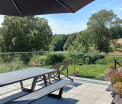 Het appartement beschikt over een privéterras met uitzicht op de vallei van de Vierre. Je deelt ook een privétuin met de eigenaars, die onder je wonen. Het tuinmeubilair zorgt ervoor dat je comfortabel buiten kan genieten van de rust en natuur. Aarzel zeker niet om de Ofyr-barbecue te gebruiken, perfect voor gezellige avonden met je geliefden.