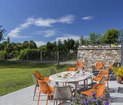 Geniet van het prachtige uitzicht vanaf het terras van dit vakantiehuisje, dat moderne en traditionele inspiratie combineert voor een ontspannen vakantie met het hele gezin.