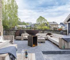 Stel je het eens voor: voor één keer is iedereen blij om het schoolplein op te lopen. Verscholen achter de smeedijzeren poort ligt het voormalige schoolgebouw, dat in 1905 opgetrokken werd uit Ardense steen. Het werd onlangs ingrijpend gerenoveerd en dat merk je: de karaktervolle uitstraling is er nog altijd, maar voortaan ook met modern comfort en een hedendaagse look. Grappige details (een bok hier, een lessenaar daar ...) verwijzen bovendien naar de geschiedenis van het pand, dat je voortaan kunt huren voor een uitzonderlijk verblijf in de Ardennen. De grote capaciteit is in ieder geval een van de voornaamste troeven. En er is aan alles gedacht, zodat de 18 mensen die hier verblijven voldoende privacy hebben: de eerste verdieping telt 8 slaapkamers met elk een eigen badkamer, stuk voor stuk ingericht in een andere stijl.  Gezelligheid is het sleutelwoord in dit vakantiehuis. Zo is de supergezellige woonkamer de ideale plek voor een diepgaande babbel bij het haardvuur. Authentieke details, zoals de zichtbare balken en een hoog plafond voor een nóg ruimere aanblik, zetten hier de toon. Wil je graag lekker aperitieven of heerlijk ontspannen? Dan kun je terecht in de bar en bij de voetbaltafel. Buiten gaat de magie verder. Heb je wel een wellnesspauze verdiend na die lange wandeling? Dan kun je kiezen tussen de twee jacuzzi's, de sauna met weids uitzicht en de infraroodcabine. Maar wat hier écht het verschil maakt, is de schuur in heuse 'pool house'-stijl met woonkamer, keuken en outdooreetkamer. Als dat geen luxe is! Natuurlijk kun je ook heerlijk de batterijen opladen op een van de terrassen, languit op een ligstoel of kletsend rond de vuurkorf. Kortom: zowel binnen als buiten zal dit prachtig gerenoveerde schoolgebouw je versteld doen staan.