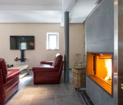 In de gezellige woonkamer met haardvuur, televisieruimte en speelzaal vindt iedereen zijn plekje om te genieten en te ontspannen.