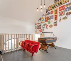 Op de bovenverdieping is een tussenverdieping ingericht als speelkamer (met een echte voetbaltafel) en bioscoop. Klein en groot kunnen hier hun hart ophalen.