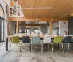 In de grote gezellige woonkamer vind je een enorme eettafel, een zithoek en een uitgeruste open keuken. Hier kan je aperitieven of je ontspannen bij de open haard terwijl je luistert naar de muziek van de jukebox (een pareltje!), … genoeg redenen dus om je te installeren in de zachte zetel.