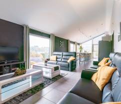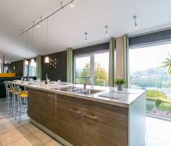 De vakantiewoning telt in totaal 4 slaapkamers, elk voorzien van een eigen televisie-installatie en privébadkamer met douche, wastafel, haardroger en toilet. De negende slaapplek werd gecreëerd in de woonkamer middels een éénpersoons slaapbank. De woonkamer en keuken zijn voorzien van enorme raampartijen, welke zorgen voor lichte, aangename leefruimtes. In de ruime woonkamer met cassettehaard, televisie en Hifi-installatie, is het heerlijk vertoeven. Of wat dacht je van de ultramoderne open keuken, met keramische kookplaat, oven, magnetron én afwasmachine? Een heerlijke plek om de dag op je gemak te beginnen, genietend van het wonderschone uitzicht met een lekkere kop Senseo koffie en een lekker ontbijtje.