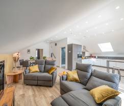 Dit prachtig ingerichte en comfortabele duplexappartement is rustig gelegen in een dorp met een bakker, minimarkt en 2 restaurants, en heeft 2 slaapkamers en 2 badkamers. De lichte woonruimte combineert een gezellige eethoek, een comfortabele woonkamer met tv en een goed uitgeruste moderne keuken die uitgeeft op een terras met adembenemend uitzicht op het omliggende platteland. Een verdieping lager vind je ook een gezellig overdekt terras met barbecue (handig bij een regenbui of bij hevige zon) met uitzicht op de tuin. Je hebt een privéparkeerplaats voor 2 auto's.