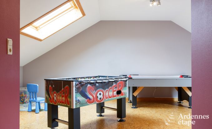 Deze ruime 4-sterren vakantiewoning is geschikt voor 12 personen in optimale omstandigheden, met 3 ruime en comfortabele slaapkamers. Twee van hen hebben een eigen badkamer en een derde badkamer is beschikbaar op de bovenverdieping. Kinderen hebben toegang tot een speelkamer op de 2e verdieping, inclusief een tafelvoetbalspel en een Tv/Dvd-ruimte. De accommodatie is bijzonder goed uitgerust en biedt ook een ontspanningsruimte met een sauna en een bubbelbad. Iedereen vervalt al snel in zijn eigen gewoontes en bij het samenbrengen van het hele gezin is de grote woonkamer op de begane grond de ideale plek met zijn zeer vriendelijke atmosfeer. De stenen open haard is mooi en belooft gezellige avonden bij het vuur in de winter. De keuken biedt een zeer complete uitrusting, waaronder een raclettestel om iets meer toe te voegen aan de maaltijden met het gezin. In de zomer zal de barbecue zeker in gebruik zijn, terwijl de kinderen zullen genieten van de glijbaan en de trampoline.