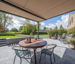 De woning beschikt over een privéterras met een overdekte pergola die je kan openen of sluiten, zodat je altijd kan genieten van het buitenleven, ongeacht het weer. Daarnaast is er een kleine, verzorgde tuin met kleurrijke bloemen, waar je in alle rust kan ontspannen. Het tuinmeubilair nodigt uit om buiten te eten of gewoon te genieten van de frisse lucht. Voor gezellige avonden is er een barbecue beschikbaar, perfect om samen te koken en te genieten van de avondzon.